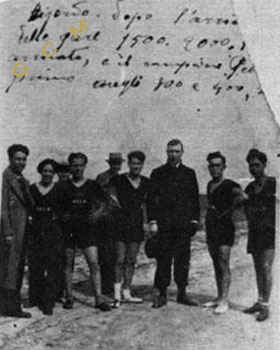 | il gruppo podistico più prestigioso di Gela del 1932. Da sinistra a destra destra si notano gli atleti: Vincenzo Maganuco (con il paletot); Nino Briffi, Tano Cassarà, Vincenzo Presti (alle cui spalle c'è Filippo Cassarino), Cola Iozza, Matteto Peritore e Pino Cacciatore |