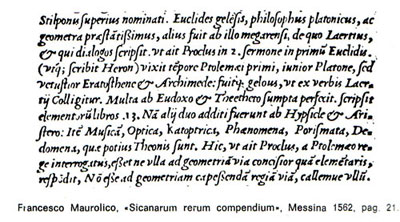 Sono andato alla ricerca di queste fonti e sentiamo cosa afferma il Murolico a pag. 21 libro I del suo volume Storia di Sicilia: “Euclides gelesis philosophus platonicus ac geometra praestantissimus…”.